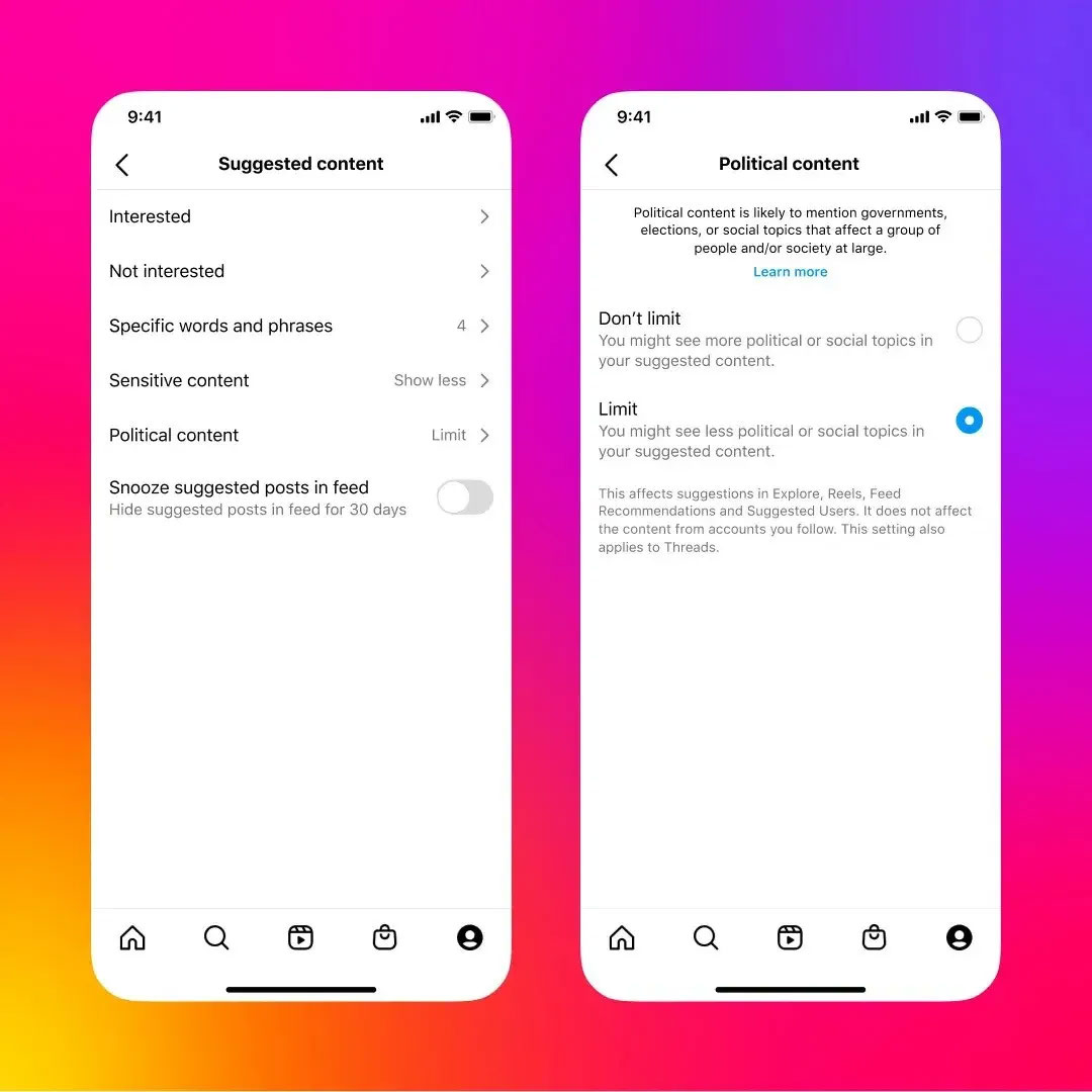 - az amerikai elnökválasztásra készülve, 2024 februárja óta a Meta algoritmusai (a Facebook 2021 óta életben lévő gyakorlatát követve) az Instagramon*92* és a Threadsen sem ajánlanak aktívan politikai jellegű*93* tartalmakat (azok a felhasználók, akik továbbra is szeretnének ilyen jellegű tartalmakat kapni, visszakapcsolhatják ezt egy felhasználói felületen);